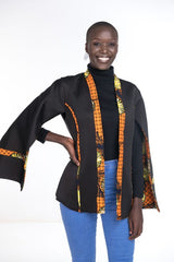 Laba means “to look” in the Luganda dialect of Baganda. This cape blazer has two print variations providing a bold & sophisticated look. It has no buttons and falls straight down, the panel design flatters the body giving one a comfortable feel. Its unique elements like two-tone fabric or the additional African print binding mean the wearer can easily blend into different settings which is definitely a plus, making it a must-have.